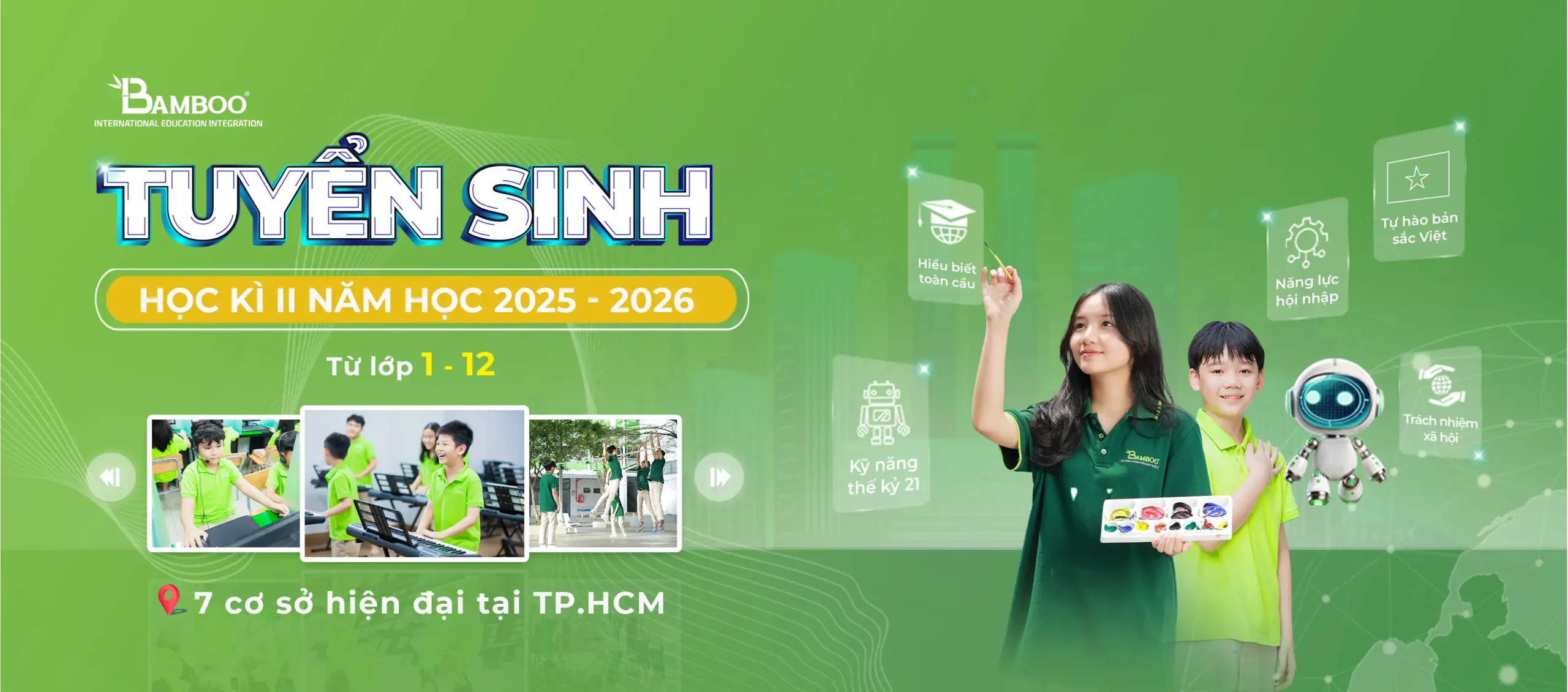 Là Hệ thống trường Hội Nhập Quốc Tế, Bamboo School góp phần tạo nên những thế hệ Công Dân Toàn Cầu biết trân trọng những giá trị truyền thống, được phát triển toàn diện về thể chất, tâm hồn và trí tuệ.
